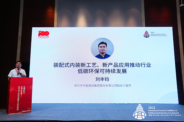 受論壇邀請(qǐng),中裝建設(shè)副總工程師劉豐鈞以《裝配式內(nèi)裝新工藝、新產(chǎn)品應(yīng)用推動(dòng)行業(yè)低碳環(huán)??沙掷m(xù)發(fā)展》為主題做大會(huì)報(bào)告。