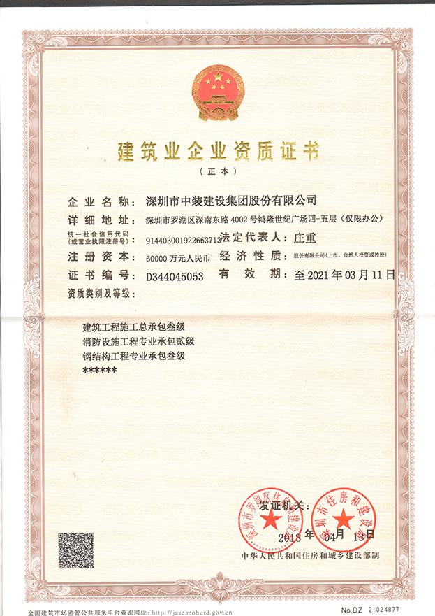 至此,中裝建設(shè)已經(jīng)具有建筑裝飾專項工程設(shè)計甲級、建筑裝修裝飾工程專業(yè)承包壹級、建筑幕墻工程專業(yè)承包壹級、電子與智能化工程專業(yè)承包壹級、建筑機(jī)電安裝工程專業(yè)承包壹級、防水防腐保溫工程專業(yè)承包壹級、展覽陳列工程設(shè)計與施工一體化壹級資質(zhì)、建筑工程施工總承包叁級資質(zhì)等行業(yè)從業(yè)資質(zhì)。